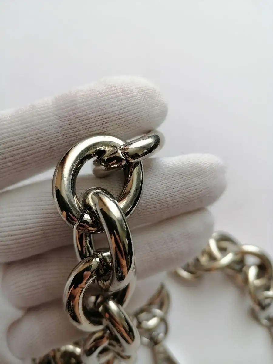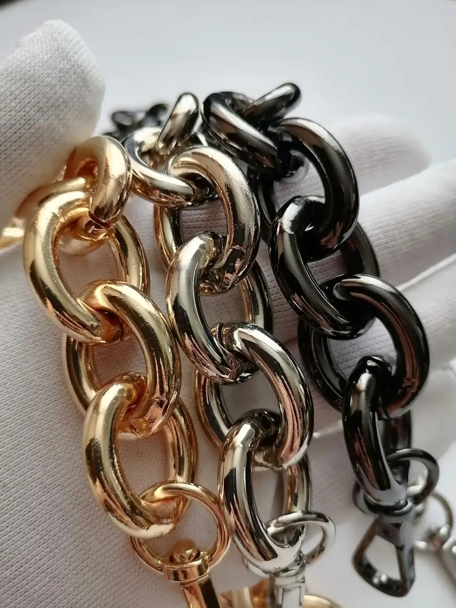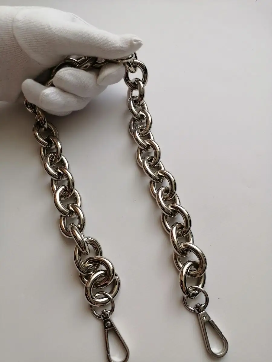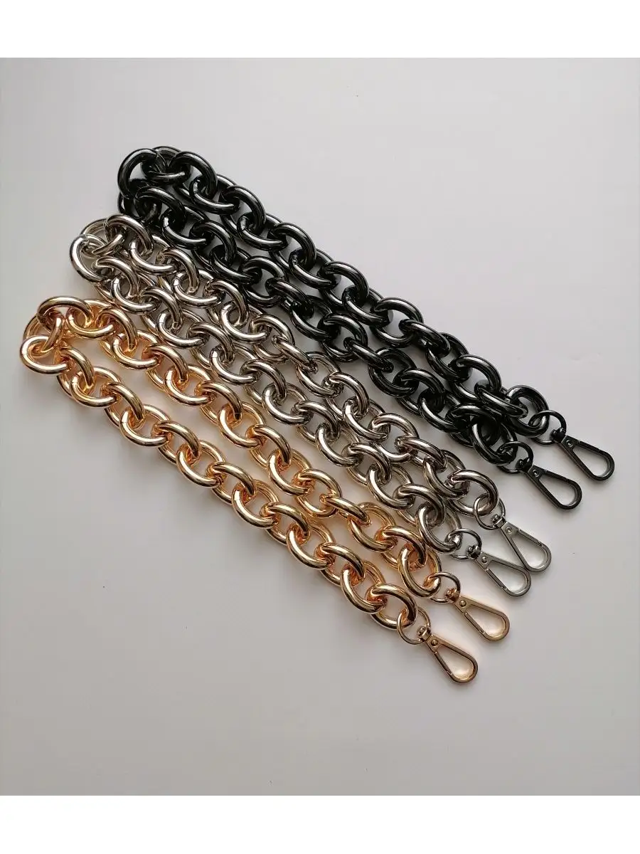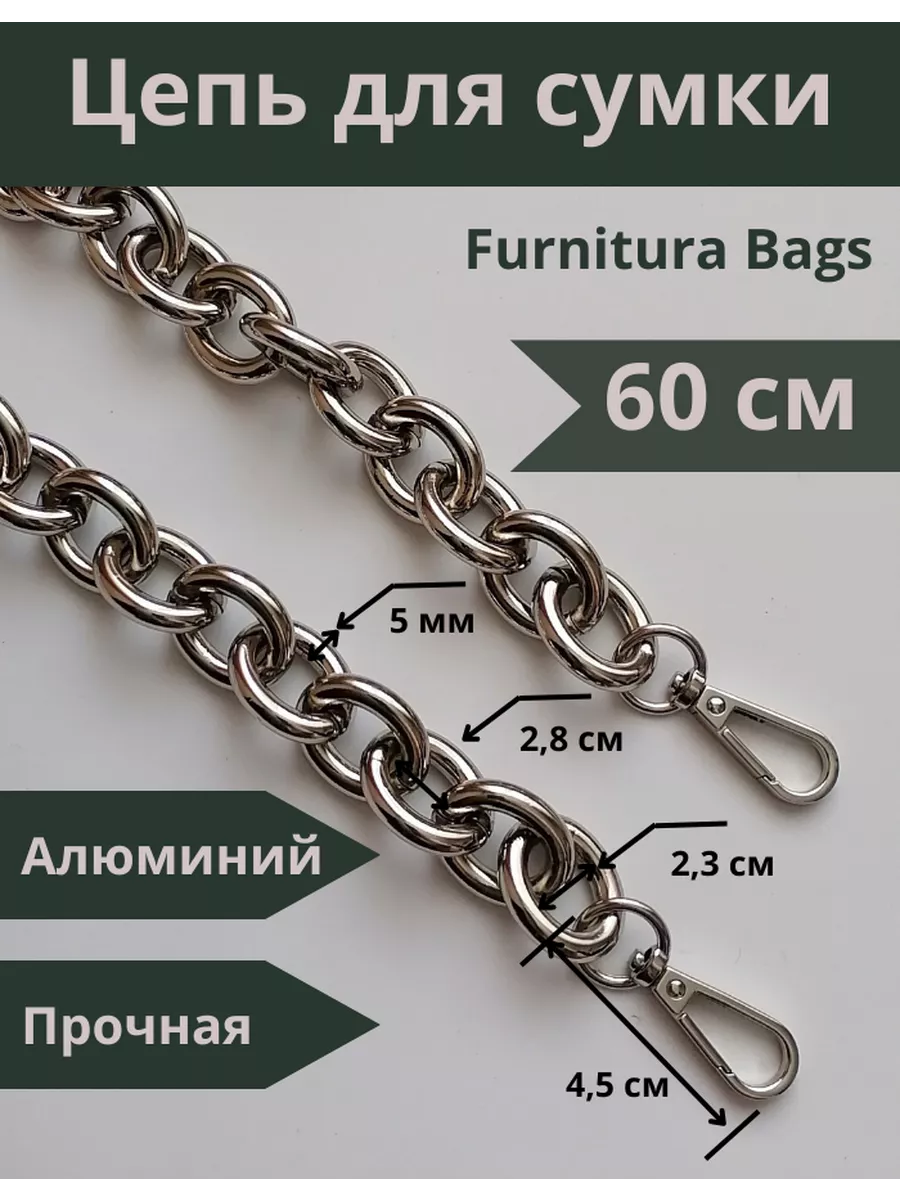 Алюминиевая крупная цепь для сумок, готовая с карабинами. Длина 60 см с карабинами. Звено 2,3*2,8 см. Толщина звена 5 мм. Тяжелая, прочная, звенья разъемные. Цепочка для сумки – это важная деталь, которая часто подвергается значительным нагрузкам, механическим воздействиям и находится в постоянном контакте с ладонью. И, конечно, такие цепочки приятно преподнести в качестве подарка маме, сестре, любимой жене или подруге. В мире моды не было такого периода, когда бы сумка на цепочке не попадала на подиумы недели моды. Это дизайн, не подвластный времени, и с каждым годом он модернизируется и эффектно обновляется. Цепочки для сумочек могут быть не только красивыми, но и комфортными в носке. Осталось подобрать красивую ручку-цепочку и восхищаться шедевром. Можно настроить длину по своему усмотрению. Форма звена позволяет легко отстегнуть и переставить. Обращаем ваше внимание, что фото не передает реальные размеры звена цепочки. Перед оформлением заказа, пожалуйста убедитесь, что указанные размеры действительно соответствуют вашим ожиданиям. Фурнитура для сумок, цепь для рукоделия, ручка для сумки. цепочка для сумки, ремень для сумки.