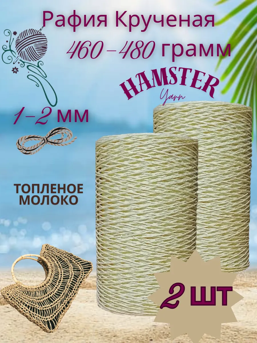 Крученая рафия Hamster Yarn 2 штуки в упаковке по 460 - 500 грамм - 1200 метров. Единственный недостаток кручёной рафии — грубость, поэтому из неё лучше не вязать людям с чувствительной кожей рук. В зависимости от цвета толщина нити варьируется 1-2 мм. Мотки разные по объёму, встречаются узлы. Цвет на фото может отличаться от реального. Рафию из целлюлозы комфортно вязать спицами и крючком. Она хорошо распускается, поэтому ее можно использовать несколько раз. Самое популярное применение рафии — это вязание головных уборов: шляп, панам и т.д. Сумки из рафии прочные, хорошо держат форму. Сочетают в себе практичность и стиль, ведь hand made аксессуары на пике популярности. Вы можете изготовить стильную сумку из рафии просто обвязав уже готовую форму — пластиковую сетку-канву. Тапочки и сандалии из рафии — это оригинальная и актуальная вещь для лета. Они легкие и фактурные. Ковры из рафии — хороший вариант для тех, кто ищет оригинальную альтернативу традиционным коврам. Такие ковры прочные и легкие, имеют уникальную текстуру, могут использоваться в гостиных, спальнях и открытых пространства. Корзинки из рафии — универсальное и практичное изделие для дома. Вяжутся просто, а выглядят очень эффектно. Вещи из рафии неприхотливы. Но для того, чтобы такие изделия прослужили вам как можно дольше, мы не рекомендуем их стирать. Просто протрите изделие влажной мягкой тканью с мыльным раствором без биоактивных и отбеливающих веществ. Рафия крученая – это натуральный и универсальный материал, идеально подходящий для различных видов рукоделия. Изготовленная из целлюлозы, она обладает приятной текстурой и легко поддается обработке. Рафия крученая – это натуральный и универсальный материал, идеально подходящий для различных видов рукоделия. Она станет незаменимым помощником в вязании, макраме, а также при создании оригинальных аксессуаров для дома. Ее прочность и гибкость позволят воплотить в жизнь самые смелые дизайнерские идеи.