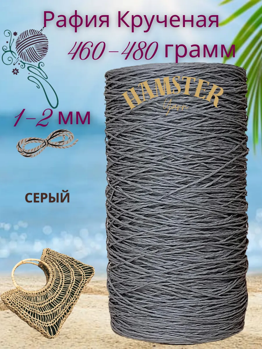 Крученая рафия Hamster Yarn 460 - 500 грамм. Единственный недостаток кручёной рафии — грубость, поэтому из неё лучше не вязать людям с чувствительной кожей рук. В зависимости от цвета толщина нити варьируется 1-2 мм. Мотки разные по объёму, встречаются узлы. Цвет на фото может отличаться от реального. Рафию из целлюлозы комфортно вязать спицами и крючком. Она хорошо распускается, поэтому ее можно использовать несколько раз. Самое популярное применение рафии — это вязание головных уборов: шляп, панам и т.д. Сумки из рафии прочные, хорошо держат форму. Сочетают в себе практичность и стиль, ведь hand made аксессуары на пике популярности. Вы можете изготовить стильную сумку из рафии просто обвязав уже готовую форму — пластиковую сетку-канву. Тапочки и сандалии из рафии — это оригинальная и актуальная вещь для лета. Они легкие и фактурные. Ковры из рафии — хороший вариант для тех, кто ищет оригинальную альтернативу традиционным коврам. Такие ковры прочные и легкие, имеют уникальную текстуру, могут использоваться в гостиных, спальнях и открытых пространства. Корзинки из рафии — универсальное и практичное изделие для дома. Вяжутся просто, а выглядят очень эффектно. Вещи из рафии неприхотливы. Но для того, чтобы такие изделия прослужили вам как можно дольше, мы не рекомендуем их стирать. Просто протрите изделие влажной мягкой тканью с мыльным раствором без биоактивных и отбеливающих веществ. Рафия крученая – это натуральный и универсальный материал, идеально подходящий для различных видов рукоделия. Изготовленная из целлюлозы, она обладает приятной текстурой и легко поддается обработке. Рафия крученая – это натуральный и универсальный материал, идеально подходящий для различных видов рукоделия. Изготовленная из целлюлозы, она обладает приятной текстурой и легко поддается обработке. Она станет незаменимым помощником в вязании, макраме, а также при создании оригинальных аксессуаров для дома. Ее прочность и гибкость позволят воплотить в жизнь самые смелые дизайнерские идеи.