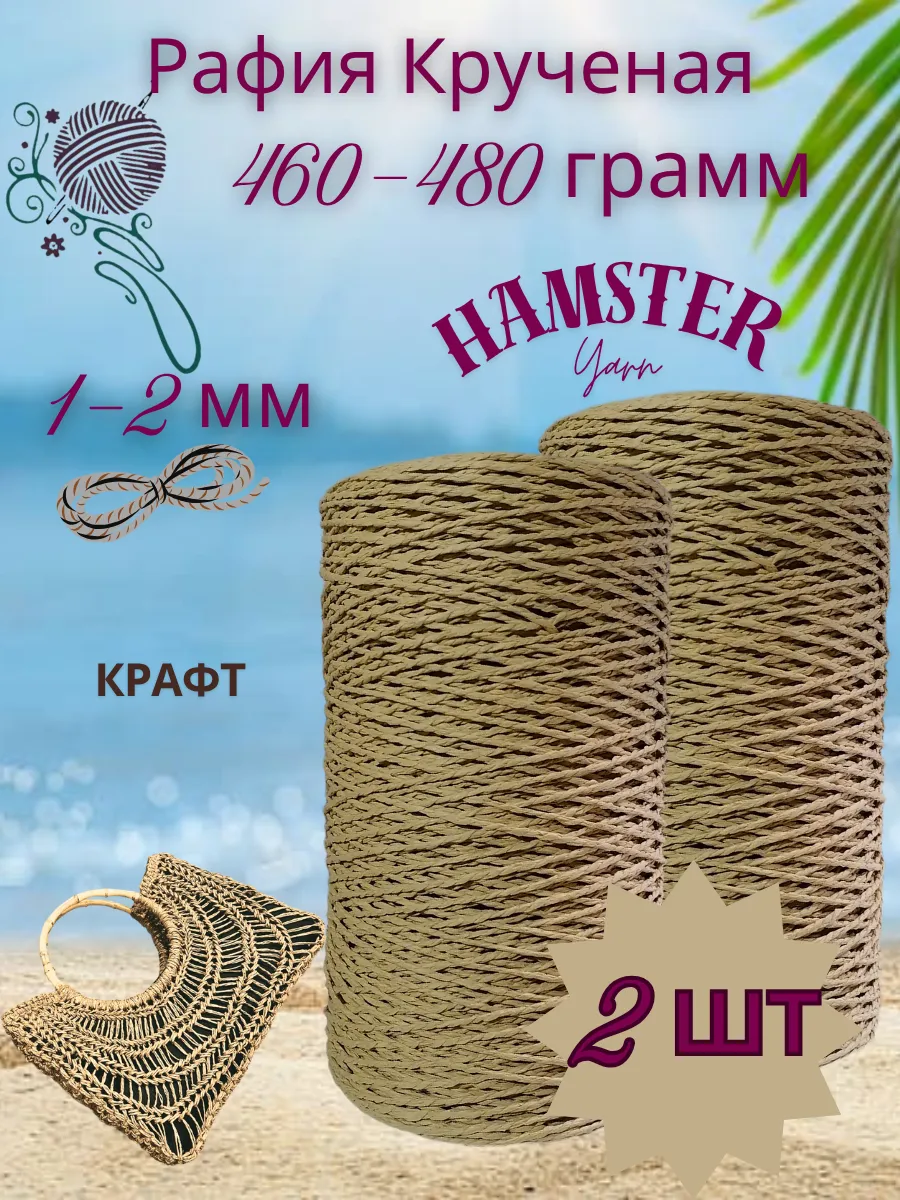 Крученая рафия Hamster Yarn 2 штуки в упаковке по 460 - 500 грамм. Единственный недостаток кручёной рафии — грубость, поэтому из неё лучше не вязать людям с чувствительной кожей рук. В зависимости от цвета толщина нити варьируется 1-2 мм. Мотки разные по объёму, встречаются узлы. Цвет на фото может отличаться от реального. Рафию из целлюлозы комфортно вязать спицами и крючком. Она хорошо распускается, поэтому ее можно использовать несколько раз. Самое популярное применение рафии — это вязание головных уборов: шляп, панам и т.д. Сумки из рафии прочные, хорошо держат форму. Сочетают в себе практичность и стиль, ведь hand made аксессуары на пике популярности. Вы можете изготовить стильную сумку из рафии просто обвязав уже готовую форму — пластиковую сетку-канву. Тапочки и сандалии из рафии — это оригинальная и актуальная вещь для лета. Они легкие и фактурные. Ковры из рафии — хороший вариант для тех, кто ищет оригинальную альтернативу традиционным коврам. Такие ковры прочные и легкие, имеют уникальную текстуру, могут использоваться в гостиных, спальнях и открытых пространства. Корзинки из рафии — универсальное и практичное изделие для дома. Вяжутся просто, а выглядят очень эффектно. Вещи из рафии неприхотливы. Но для того, чтобы такие изделия прослужили вам как можно дольше, мы не рекомендуем их стирать. Просто протрите изделие влажной мягкой тканью с мыльным раствором без биоактивных и отбеливающих веществ. Рафия крученая – это натуральный и универсальный материал, идеально подходящий для различных видов рукоделия. Изготовленная из целлюлозы, она обладает приятной текстурой и легко поддается обработке. Рафия крученая – это натуральный и универсальный материал, идеально подходящий для различных видов рукоделия. Она станет незаменимым помощником в вязании, макраме, а также при создании оригинальных аксессуаров для дома. Ее прочность и гибкость позволят воплотить в жизнь самые смелые дизайнерские идеи.